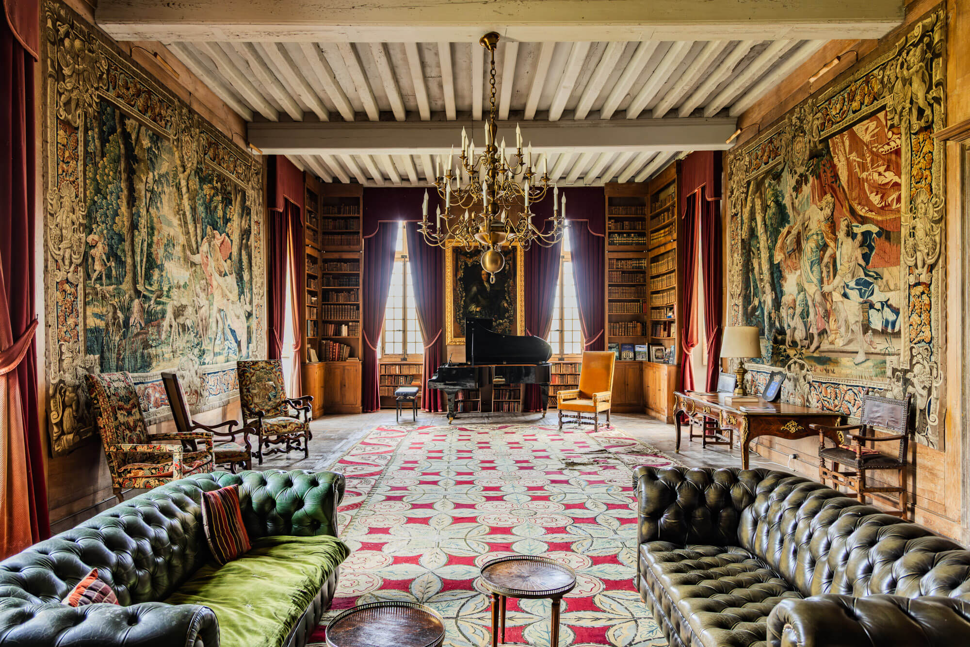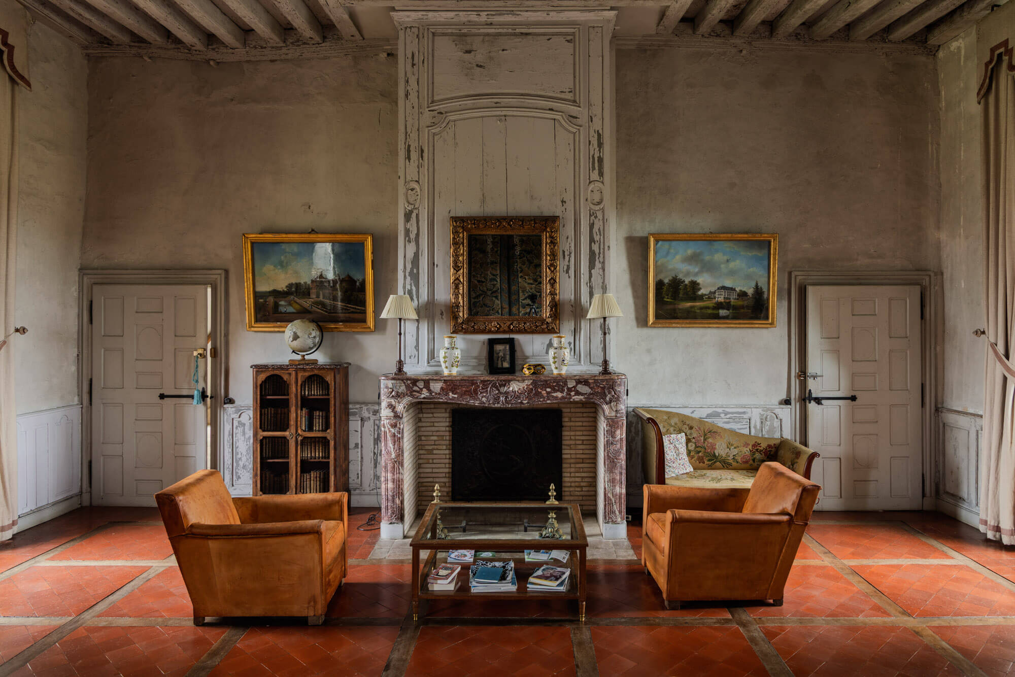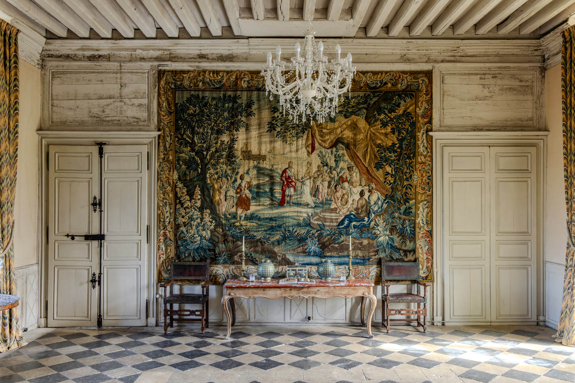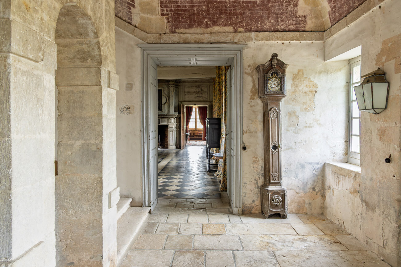Although reconfigured during the 18th and 19th centuries, the château retains its 17th-century layout along with many elements of its original décor. In many respects, it still appears much as it did four centuries ago. Here, what is suggested on the exterior finds its full expression within. As we have seen, the staircase occupies the very heart of the building. It seems to rise endlessly, connecting every level, from the fully vaulted basement spaces once devoted to domestic service to the uppermost attic floor. The two principal floors share a rigorously identical layout: a grand hall within the main corps de logis and a private apartment in the lateral wing. The symmetry of the façades is echoed by a double interior symmetry, both horizontal and vertical. From the 17th century, the château preserves its traditional French ceilings (plafonds à la française), stone-flagged and terracotta tile floors, several monumental fireplaces, and remnants of painted decoration. From the 18th century remain marble fireplaces, parquet flooring with compartmentalized patterns, and the creation of the dining room. The library, meanwhile, was fitted out during the 19th century.